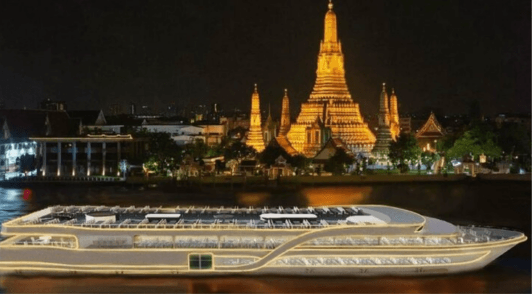 Sail past Bangkok’s most iconic sights, including Wat Arun (Temple of Dawn), the Grand Palace, and the Rama VIII Bridge, all brilliantly lit against the night sky. The atmosphere is perfected by a live international band and graceful traditional Thai dance performances.